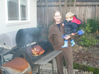 The Chef & his Mini-Assistant smoking a turkey for Christmas dinner.